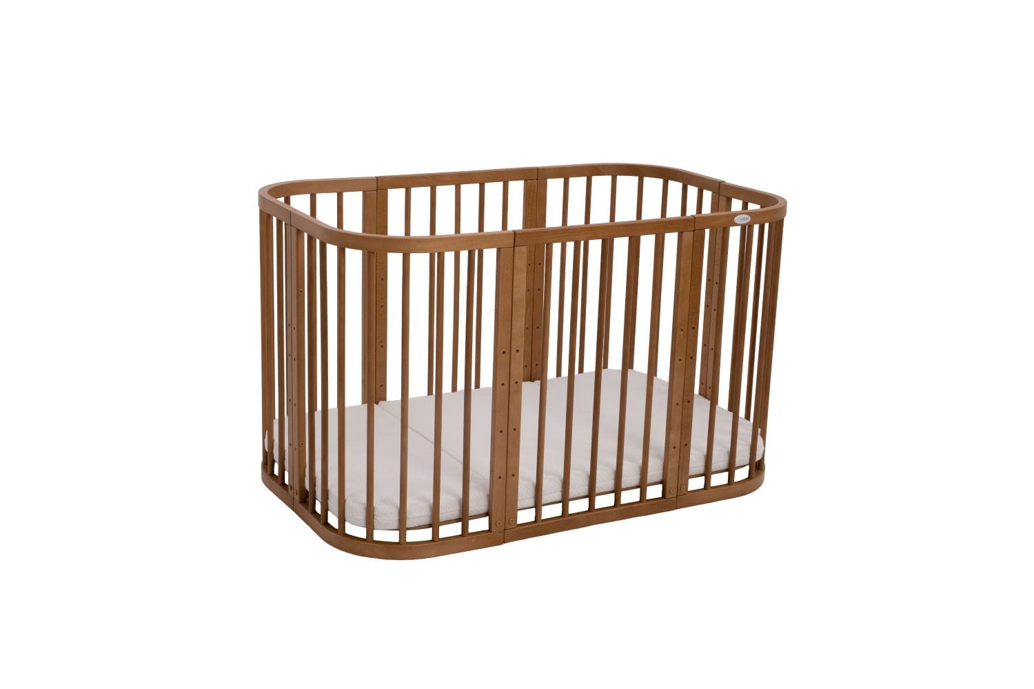 Drewniane, wielofunkcyjne łóżeczko 7 w 1 z materacem, które rośnie z dzieckiem! W zestawie pas zabezpieczający do dostawki oraz gumowane kółka.